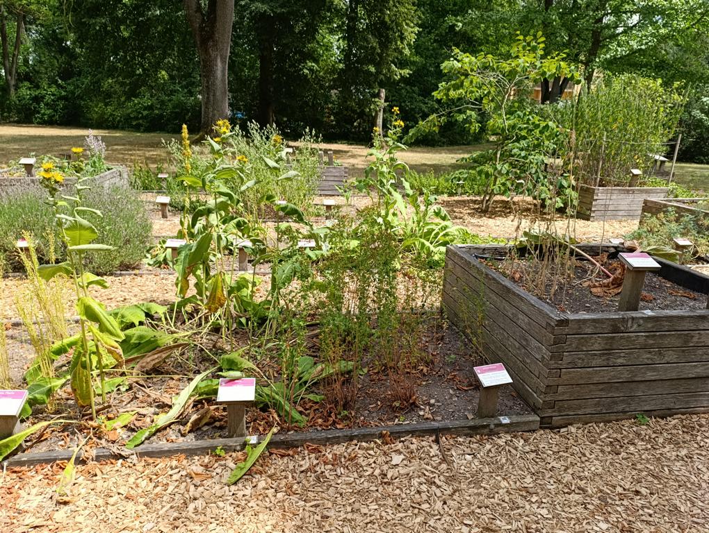 Durch die Gartenanlage mit ihren Sträuchern, Bäumen und Blumenbeeten spaziere ich weiter;